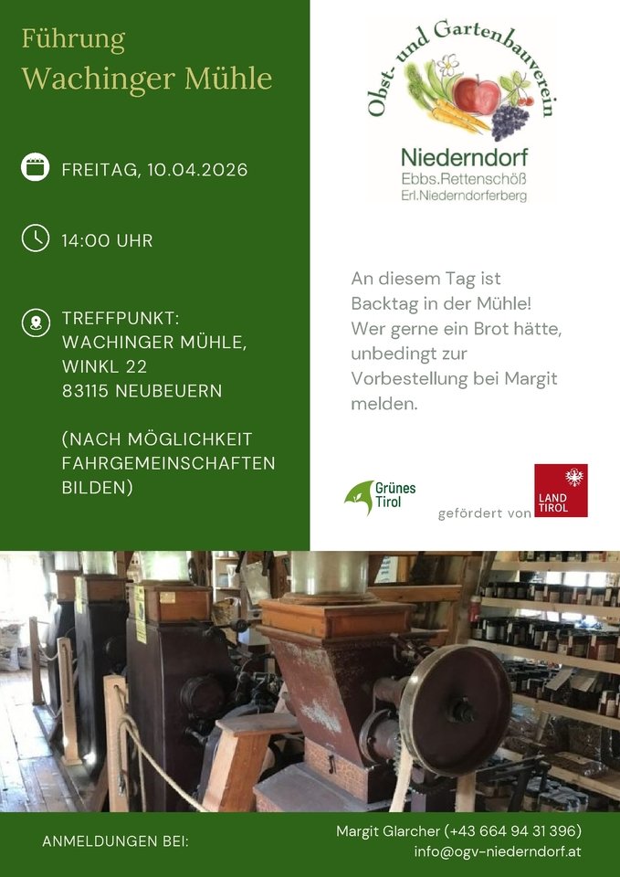 An diesem Tag ist außerdem Backtag (Holzofen) in der Mühle - wer gerne ein Brot hätte, unbedingt zur Vorbestellung bei Margit melden.