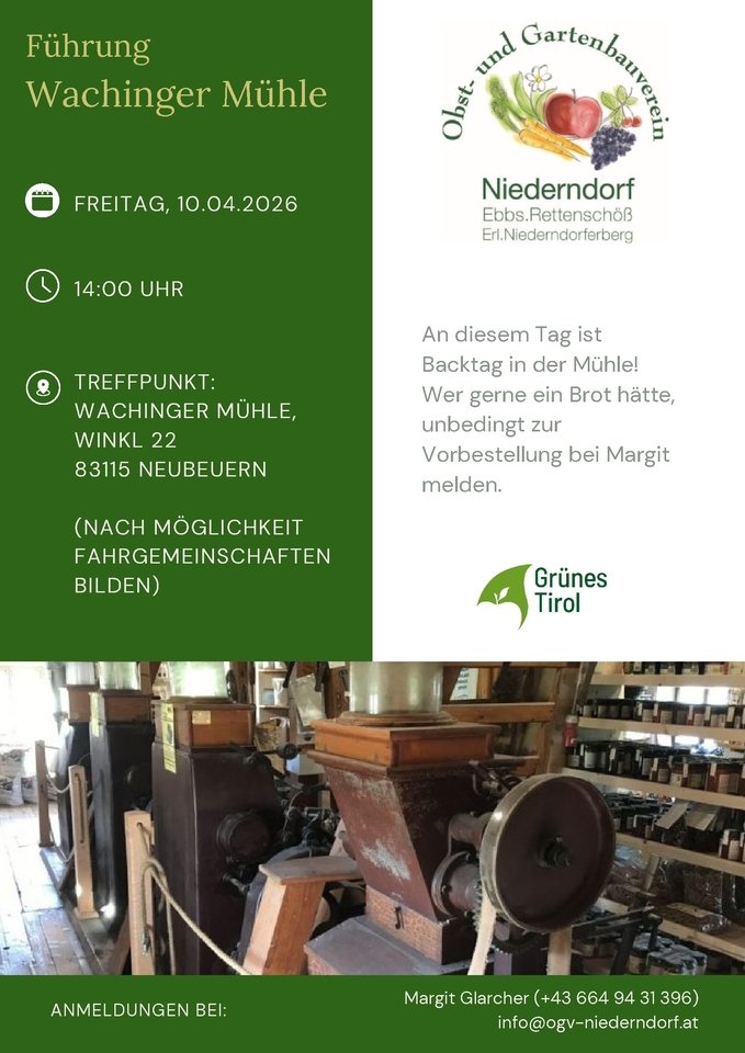 An diesem Tag ist außerdem Backtag (Holzofen) in der Mühle - wer gerne ein Brot hätte, unbedingt zur Vorbestellung bei Margit melden.
